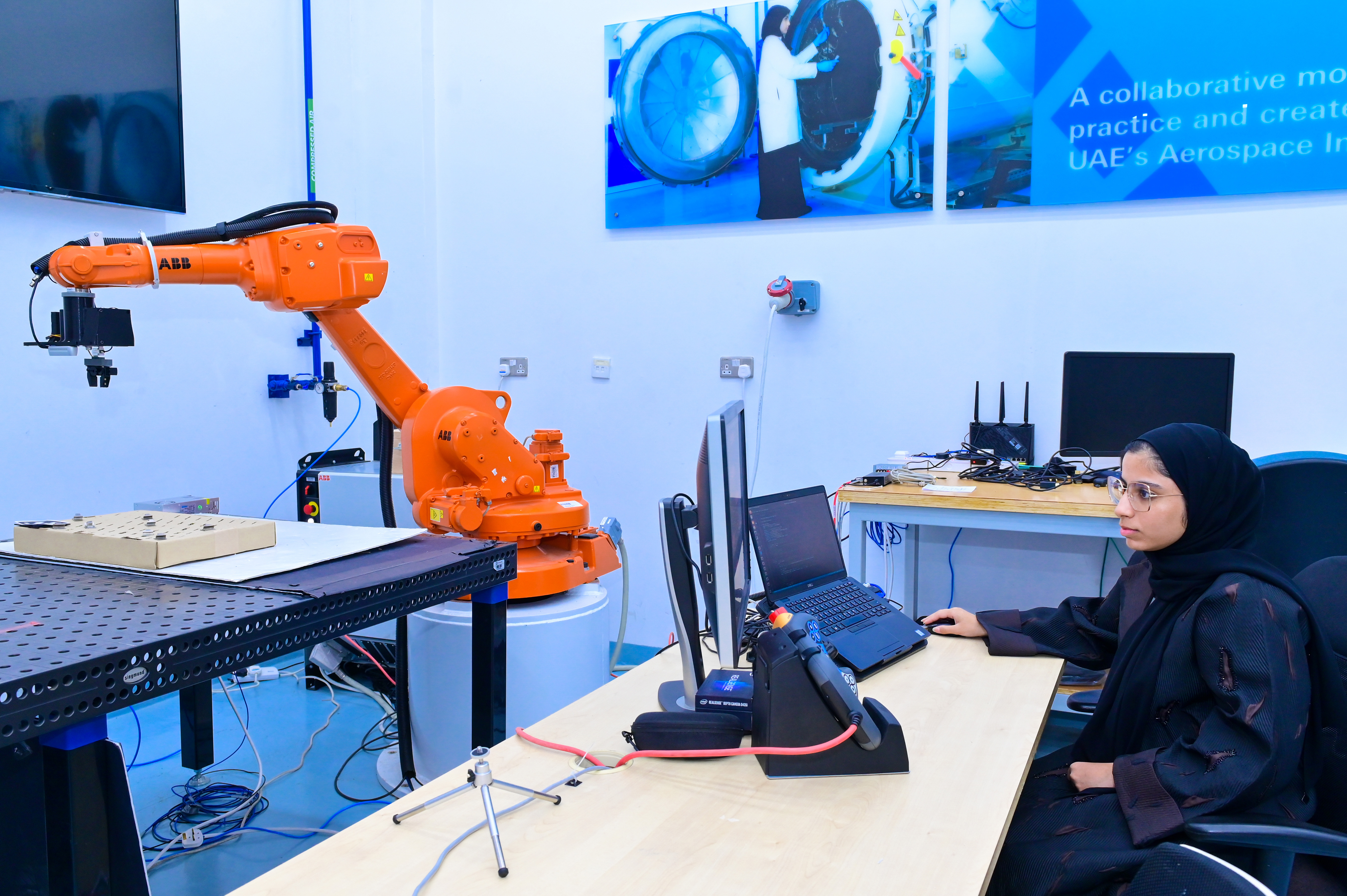 The automation of cyber-physical manufacturing processes through industrial robots is a critical aspect of the Fourth Industrial Revolution (4IR). Robots have the potential to boost production volume while guaranteeing higher levels of precision and safety. With the UAE aiming to become a global hub in 4IR technology with initiatives such as the ‘4IR strategy’ and ‘Operation AED 300 billion’, the Advanced Research & Innovation Center (ARIC) of Khalifa University has been actively developing robotic solutions for the national manufacturing industry. Through collaboration with STRATA Manufacturing and Mubadala Aerospace, the center has developed the first robot of its kind capable of fully automating drilling processes in Aeroplane structure. The robot features an arrayof sensing technologies and AI algorithms that enable it to autonomously navigate across the factory then perform the required tasks within aerospace-grade tolerances. The center is currently expanding its robotic manufacturing activities through the development of the second generation of this robot, which extend the capabilities of the first generation to automate full production lines with different functions such as: deburring, painting, and inspection. The new generation is planned to be put in action by the end of 2023 upon undergoing a qualification process by top aerospace companies.